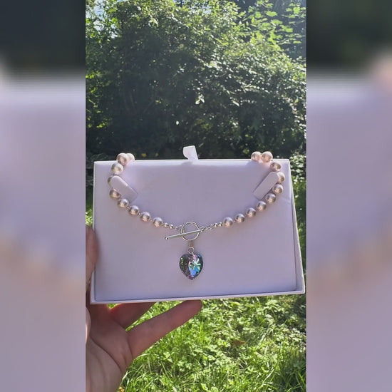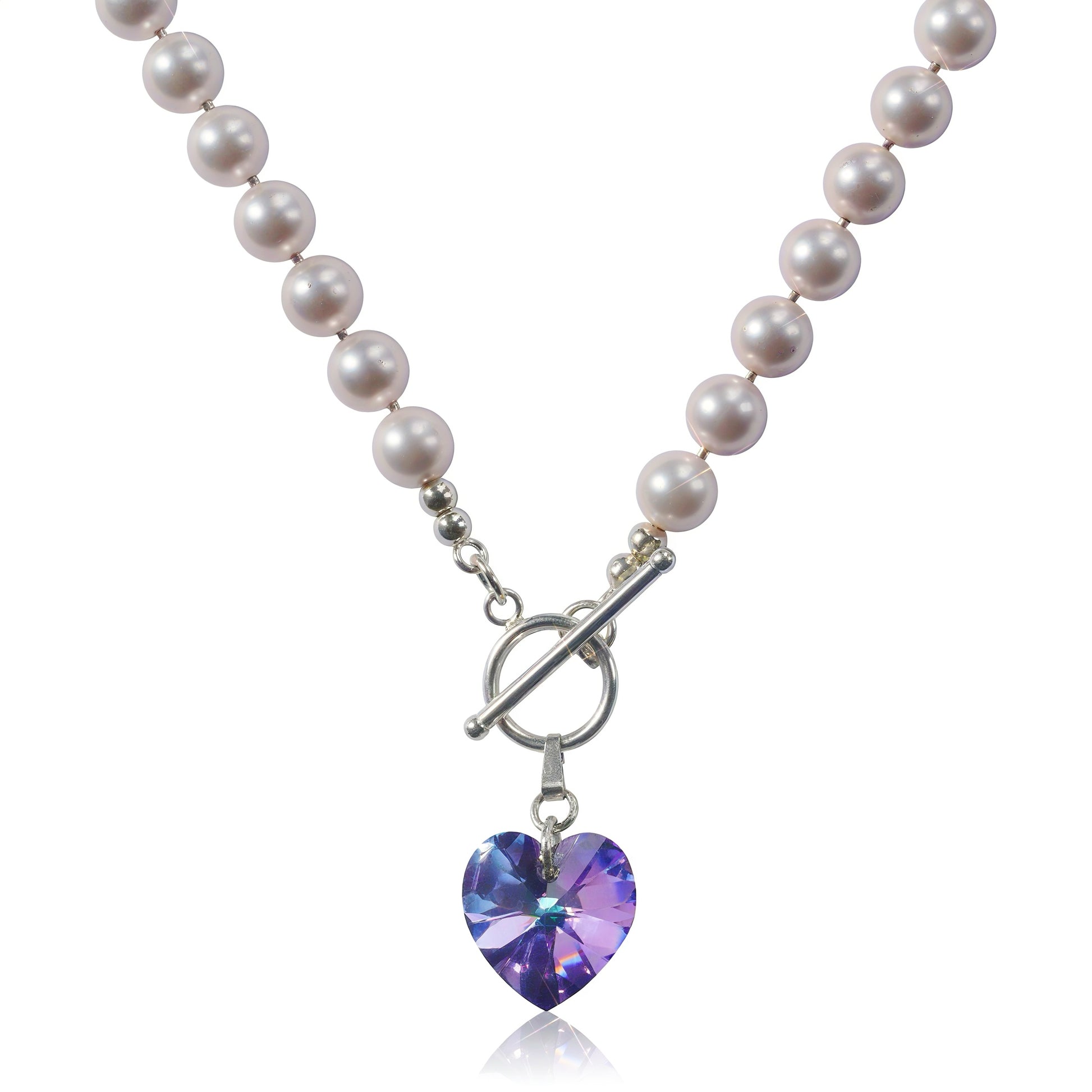 Elevate your everyday look with this romantic twist on a classic. Our Blush Pearl Necklace is crafted from lustrous pink shell pearls or genuine freshwater pearls and finished with premium sterling silver components for a refined touch. The showstopper? A dazzling Swarovski® crystal heart pendant in a rich violet-blue hue, offering brilliant sparkle from every angle.